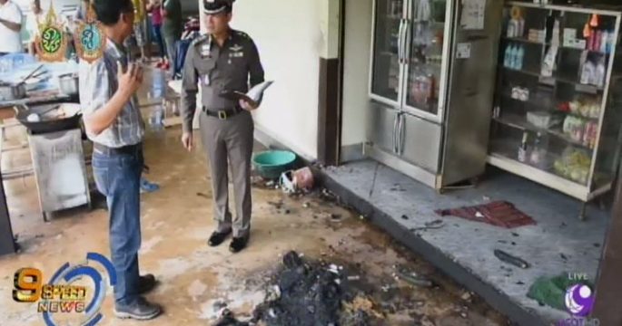 พนักงานสอบสวน สภ.เมืองจันทบุรี เข้าตรวจสอบบริเวณร้านขายของชำ ภายในชุมชนบ้านโป่งแรด อ.เมืองจันทบุรี หลังเกิดเหตุเพลิงไหม้ มีผู้บาดเจ็บสาหัส 4 คน