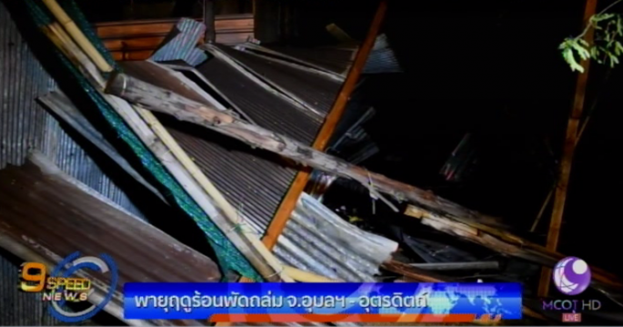 พายุฤดูร้อนพัดถล่มจ.อุบลฯ น้ำท่วมผิวการจราจรสูง 30 ซม.เสาไฟหัก 3 ต้น ส่วนอุตรดิตถ์ลูกเห็บถล่มบ้านเรือนเสียหาย 200 หลังรุนแรงสุดในรอบ 45 ปี