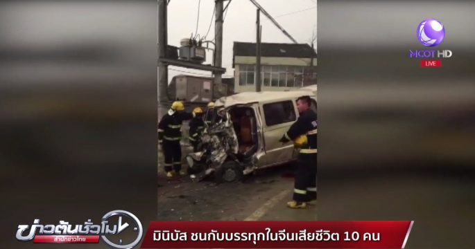 รถบรรทุกวิ่งข้ามเลนพุ่งประสานงากับรถบัสโดยสาร บนทางด่วน บริเวณมณฑลเจียงสู ภาคตะวันออกของจีน เมื่อเช้าตรู่วันนี้ จนรถบัสพลิกคว่ำ ทำให้มีผู้เสียชีวิต 11 คน บาดเจ็บ 19 คน