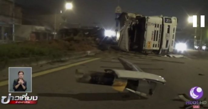 รถพ่วงซิ่งแข่งกันจนพลิกคว่ำ ไม้ยางพาราหล่นกวาดรถยนต์-ร้านค้าพังยับ