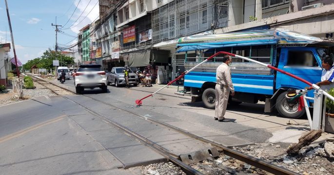 อุทาหรณ์! รถสองแถวไม่หยุดรอสัญญาณจุดตัดทางไฟ ถนนนิคมรถไฟมหาชัย เมืองสมุทรสาคร ชนเครื่องกั้นไม้หักฟาดใส่กระจกหน้ารถตก ถูกชายคนขับวัย 47 ปี บาดเจ็บ ส่วนขบวนรถไฟมหาชัย-วงเวียนใหญ่ ผ่านได้ปกติ