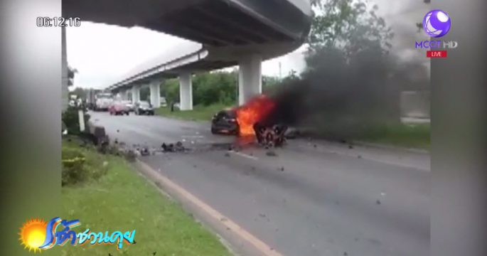 หวิดถูกไฟคลอก! เก๋งเสียหลักพุ่งข้ามเกาะกลางไปชนกับรถเก๋งอีกคันบนถนนมิตรภาพ ใต้สะพานกลับรถหน้าวัดหลวงพ่อโต ขาเข้า อ.สีคิ้ว จ.นครราชสีมา ไฟลุกท่วม พลเมืองดีเข้าช่วย 4 ชีวิตรอด