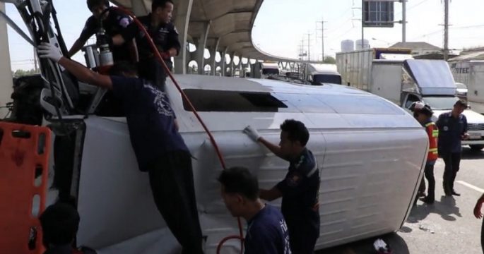 รถตู้พานักท่องเที่ยวฝรั่งเศสจะไปเกาะช้างเบรกไม่อยู่ชนคันอื่นอีก 2 กลางมอเตอร์เวย์บางปะกง-ฉะเชิงเทรา บาดเจ็บ 8 ราย