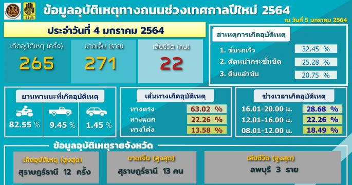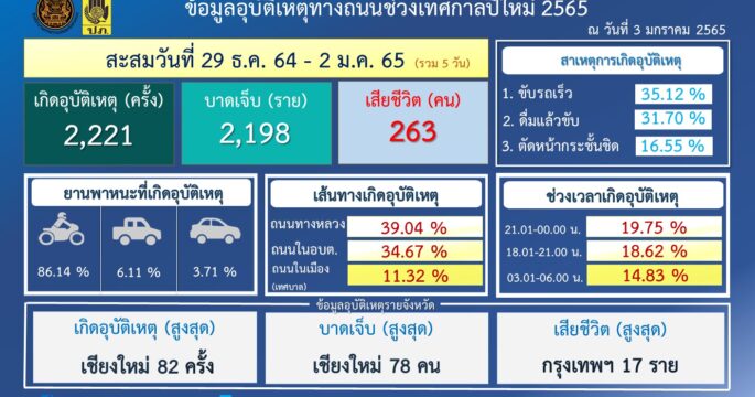 ศปถ. เผยสถิติอุบัติเหตุทางถนนประจำวันที่ 2 ม.ค.65 เกิดอุบัติเหตุ 307 ครั้ง ผู้เสียชีวิต 34 ราย ผู้บาดเจ็บ 311 คน สรุปอุบัติเหตุสะสมช่วง 5 วันของการรณรงค์ (29 ธ.ค.64 – 2 ม.ค.65) เกิดอุบัติเหตุรวม 2,221 ครั้ง ผู้เสียชีวิตรวม 263 ราย ผู้บาดเจ็บรวม 2,198 คน