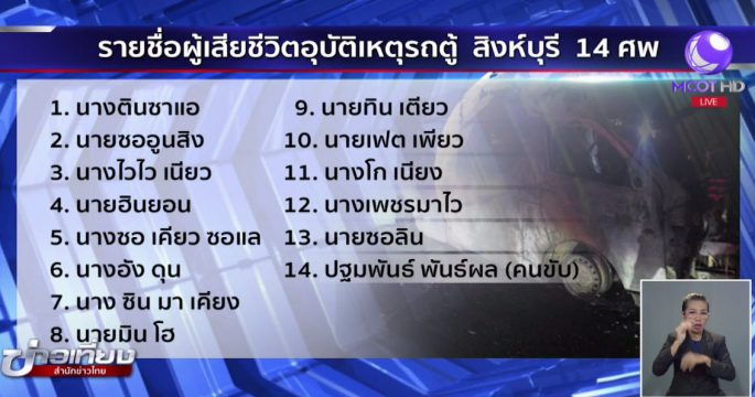 เกิดอุบัติเหตุสลด รถตู้ขนส่งแรงงานต่างด้าวชนท้ายรถสิบล้อ บนถนนสายเอเชียช่วงจังหวัดสิงห์บุรี ทำให้ไฟไหม้รถตู้ ย่างสดผู้โดยสารทั้งหมด 14 คน