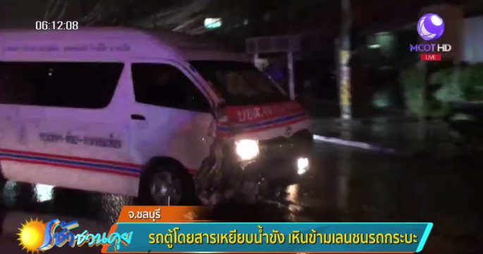 รถตู้โดยสารกรุงเทพฯ-พัทยา ซิ่งเหยียบน้ำขัง เหินข้ามเลนชนรถกระบะ บริเวณถนนสุขุมวิท อ.ศรีราชา จ.ชลบุรี เจ็บ 12 คน