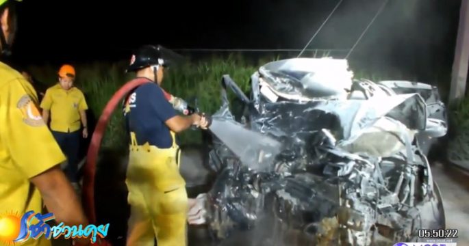 รถตู้ประสานงารถยนต์จนไฟลุก บนถนนสายปลวกแดง-โรงน้ำตาล ต.ตาสิทธิ์ อ.ปลวกแดง จ.ระยอง เสียชีวิต 3 ราย คนขับรถตู้บาดเจ็บสาหัส