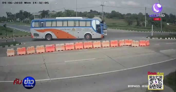 รถทัวร์โดยสารพุ่งชนรถโม่ปูน บริเวณสามแยกไม่มีไฟแดง อ.บ้านไผ่-บรบือ จ.ขอนแก่น วงจรปิดเผยรถโม่ปูนจะขับตัดหน้า ก่อนถูกรถทัวร์พุ่งชน ผู้โดยสารกว่า 20 คน บาดเจ็บเล็กน้อย