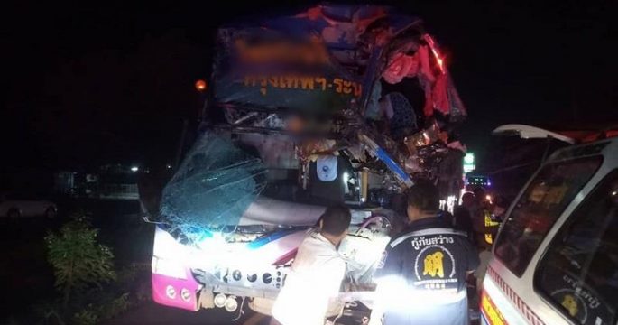 รถทัวร์ 2 ชั้นนำเที่ยวพุ่งชนท้ายรถบรรทุกพ่วง 18 ล้อ บริเวณทางหลวงสาย 24 สีคิ้ว-อุบลราชธานี อ.ปราสาท จ.สุรินทร์ จนรถพังยับ หน้ารถยุบเข้ามาถึงที่นั่งคนขับ แต่โชคดีไม่มีผู้เสียชีวิตหรือบาดเจ็บสาหัส