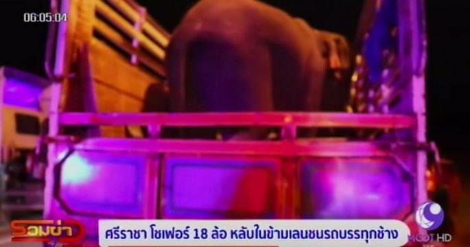 คนขับ 18 ล้อ วูบหลับใน พุ่งข้ามเลนชนรถ 6 ล้อบรรทุกช้าง บนถนนสาย 331 (พนมสารคาม-สัตหีบ) บริเวณตำบลบ่อวิน อำเภอศรีราชา จังหวัดชลบุรี บาดเจ็บ 1 คน ส่วนช้างปลอดภัย