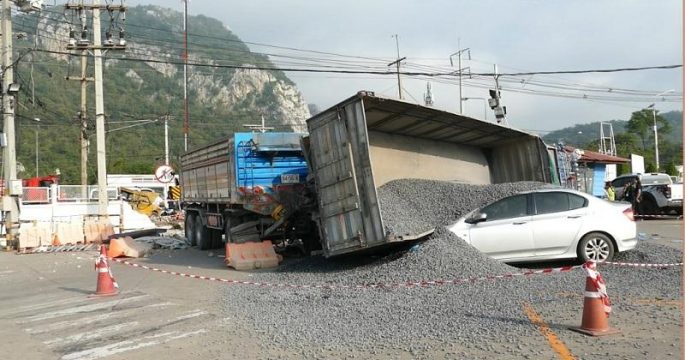 รถพ่วง 28 ล้อ บรรทุกข้าวเปลือกมาเต็มคันรถ หลุดโค้งบ้านเสี้ยว อ.เมือง จ.เลย พลิกคว่ำทับรถยนต์ของนักท่องเที่ยวที่ขับกลับจาก อ.เชียงคาน มุ่งหน้ากรุงเทพฯ ทำให้มีผู้บาดเจ็บสาหัส 6 คน เสียชีวิต 2 คน