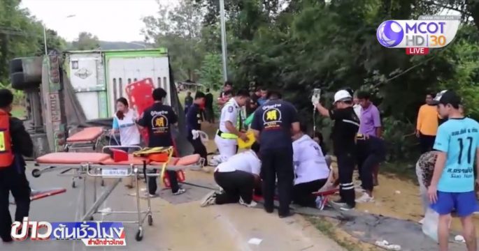 สระบุรี 16 ต.ค.- รถพ่วงบรรทุกหินคลุกมาเร็วแซงลงเนินเบรคไม่อยู่ชนระนาวหน้าโรงงานไก่สระบุรี ชายวัย 20 ปี เสียชีวิต รถเสียหายอีก 5 เจ็บ 6 เมื่อเวลา 08.00 น. (16 ต.ค.) ร.ต.อ.จิรเดช จิรวัชรานันท์ ร้อยเวร สภ.พระพุทธบาท จ.สระบุรี รับแจ้งอุบัติรถชนกันหลายคันบริเวณโรงงานไก่ ถ.หน้าพระลาน-บ้านครัว ม.2 ต.เขาวง อ.พระพุทธบาท จ.สระบุรี จีงประสานอาสาสมัครมูลนิธิร่วมกตัญญูเข้าช่วยเหลือและอำนวยความสะดวกการจราจร เนื่องจากรถติดยาวเหยียด ส่วนอุบัติเหตุเป็นรถพ่วงบรรทุกหินคลุก สภาพส่วนหัวพลิกตะแคงชนกับป้อมยามโรงงาน และพ่วงท้ายทับผู้เสียชีวิตเป็นชาย อายุ 20 ปี นอกจากนี้ ยังมีรถยนต์เสียหายอีก 5 คัน มีผู้บาดเจ็บ 6 ราย เจ้าหน้าที่นำส่งไปโรงพยาบาลพระพุทธบาท สอบสวนพยานแวดล้อมทราบว่ารถพ่วงคันดังกล่าววิ่งแซงมาด้วยความเร็วขณะลงเนิน คาดว่าเบรคแตก จากนั้นได้พุ่งเข้าชนรถที่จอดอยู่บนถนนอีกหลายคัน ซึ่งเจ้าหน้าที่ได้คุมตัวคนขับรถพ่วงไว้สอบปากคำอีกครั้ง และนำกล้องวงจรปิดมาตรวจสอบเพื่อเป็นหลักฐานดำเนินคดี.-สำนักข่าวไทย