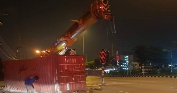 ตำรวจคุมตัวคนขับรถพ่วงดำเนินคดีจากเหตุตู้คอนเทนเนอร์บรรทุกปุ๋ยเกือบ 20 ตัน ร่วงกระแทกเก๋ง 2 คัน บนถนนโรจนะ-อยุธยา เสียชีวิต 1 ราย