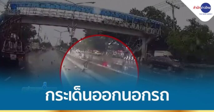 รถพ่วง 18 ล้อ ชนแบร์ริเออร์เกาะกลางถนน ทำให้ภรรยาคนขับที่นั่งมาด้วยกระเด็นออกจากรถ ข้ามไปอีกฝั่งถนน