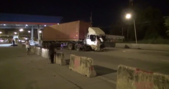 รถพ่วง 18 ล้อ ชนด่านเก็บเงินสร้างใหม่บนมอเตอร์เวย์ พังยับ คนขับเจ็บ