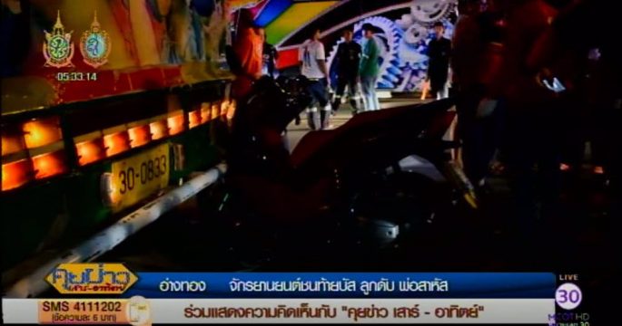 พ่อขี่ จยย.พาลูกสาวมารอรับแม่ที่อ่างทอง พุ่งชนท้ายรถบัสรับส่งพนักงาน ทำให้ลูกเสียชีวิต พ่อเจ็บสาหัส ส่วนที่นครพนมเก๋งปีนเกาะกลางถนน 2 คันรวด