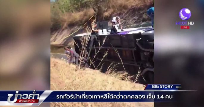 รถทัวร์นักท่องเที่ยวเกาหลีใต้ประสบอุบัติเหตุหลุดโค้ง ตกคลองชลประทาน เหตุเพราะคนขับหันไปมองเกียร์รถ ทำให้มีผู้บาดเจ็บ 14 คน อาการสาหัส 5 คน