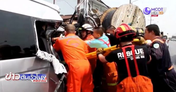 รถตู้พุ่งชนท้ายรถการไฟฟ้า บริเวณบ้านหนองอาบช้าง อ.แม่ริม จ.เชียงใหม่ คนขับรถตู้เจ็บสาหัสติดคาซากรถ ส่วนเจ้าหน้าที่การไฟฟ้าบาดเจ็บเล็กน้อย