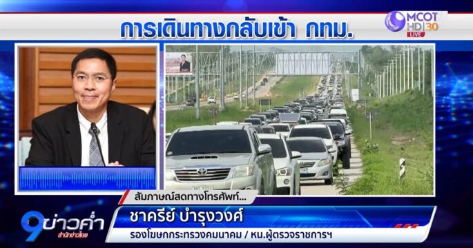 ตรวจสอบการเดินทางภาพรวมเข้ากรุงเทพฯ ทั้งทางรถโดยสารสาธารณะ หรือ บขส. ทางรถไฟ ทางเครื่องบิน แนะนำเส้นทางกลับและสถิติอุบัติเหตุที่เกิดขึ้น จากคุณชาครีย์ บำรุงวงศ์ รองโฆษกกระทรวงคมนาคมและหัวหน้าผู้ตรวจราชการกระทรวงคมนาคม