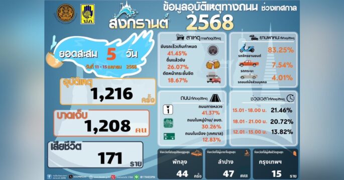 ศปถ. รายงานอุบัติเหตุทางถนนช่วงสงกรานต์ สะสม 5 วัน มีผู้เสียชีวิตจากอุบัติเหตุแล้ว 171 ราย กทม. เสียชีวิตสูงสุด 15 ราย สาเหตุจากขับรถเร็ว ร้อยละ 36.92