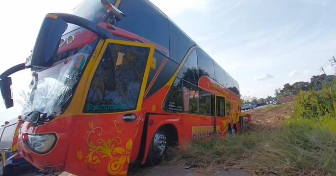 บัสคณะแสวงบุญชนท้ายรถหกล้อ จอดเตรียมซ่อมไฟส่องสว่าง มีผู้เสียชีวิต 2 ราย บาดเจ็บ 24 คน