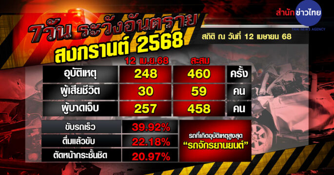 สรุปสถิติการเกิดอุบัติเหตุทางท้องถนนในช่วงเทศกาลสงกรานต์ปี 2568 วันที่ 2 ของการรณรงค์ “ขับขี่ปลอดภัย เมืองไทยไร้อุบัติเหตุ” เกิดอุบัติเหตุ 248 ครั้ง มีผู้เสียชีวิต 30 ราย ส่วนสาเหตุหลักยังคงมาจากขับรถเร็ว