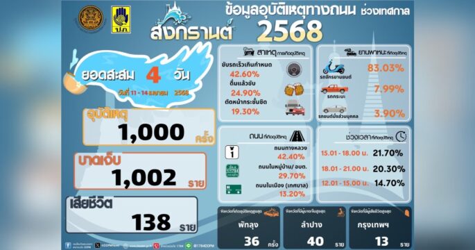 ศปถ. แถลงข้อมูลอุบัติเหตุทางถนนช่วงเทศกาลสงกรานต์ 68 พบ 4 วัน เกิดอุบัติเหตุ 1,000 ครั้ง เสียชีวิต 138 ราย พัทลุง อุบัติเหตุสะสมสูงสุด 36 ครั้ง ขณะที่กรุงเทพฯ ยอดผู้เสียชีวิต 13 ราย