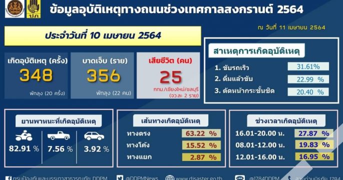 ศปถ.ประสานจังหวัดเข้มข้นดูแลความปลอดภัยเส้นทางเชื่อมต่อสู่ภูมิภาค พบอุบัติเหตุ 348 ครั้ง ผู้เสียชีวิต 25 ราย ผู้บาดเจ็บ 356 ราย โดยการขับรถเร็วยังคงเป็นสาเหตุที่ทำให้เกิดอุบัติเหตุสูงสุด รองลงมาดื่มแล้วขับ กำชับด่านตรวจยานพาหนะและความพร้อมผู้ขับขี่ ควบคู่เฝ้าระวังโควิด-19