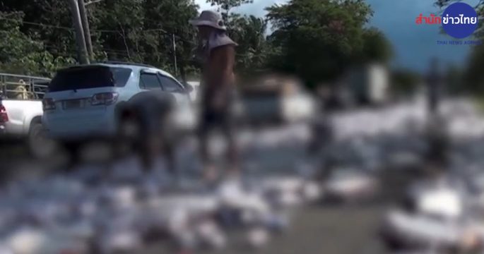 รถบรรทุกพ่วงขนเบียร์เสียหลักพลิกเทกระจาด กระป๋องเบียร์จำนวนมากร่วงเกลื่อนถนนสายเอเซีย 41 ฝั่งขาล่องใต้ หน้าหมวดทางหลวงสวี ทำรถติดยาวกว่า 3 กม.