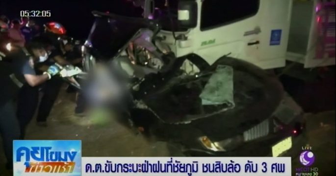 พายุฤดูร้อนพัดกระหน่ำเมืองชัยภูมิ ถนนลื่น ปิกอัพแหกโค้ง 100 ศพ ชนประสานงา 10 ล้อที่ขับฝ่าฝนมา ครอบครัวดาบตรี 3 พ่อแม่ลูกดับ