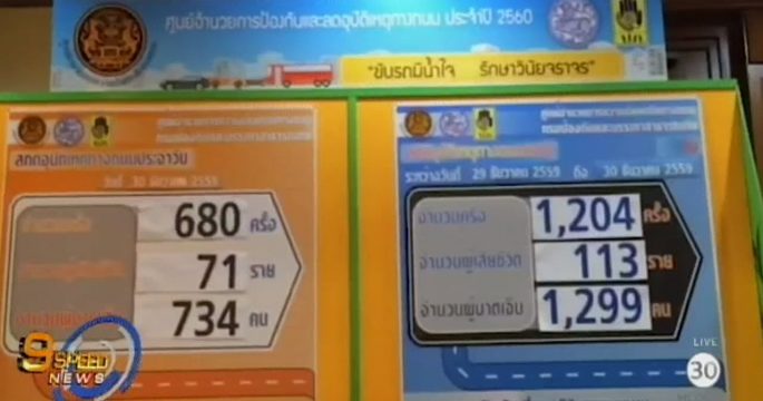 ศูนย์อำนวยการป้องกันและลดอุบัติเหตุทางถนน ประจำปี 2560 เผยสถิติอุบัติเหตุทางถนน ประจำวันที่ 30 ธันวาคม 2559 เกิดอุบัติเหตุ 680 ครั้ง