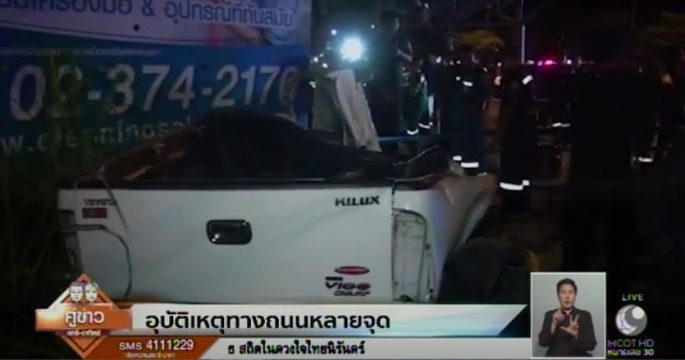 รถกระบะประสานงาแท็กซี่แล้วกระเด็นไปชนรถสามล้อบรรทุกคนพิการ ทำให้คนขับแท็กซี่เสียชีวิต 1 ราย และบาดเจ็บ 6 ราย