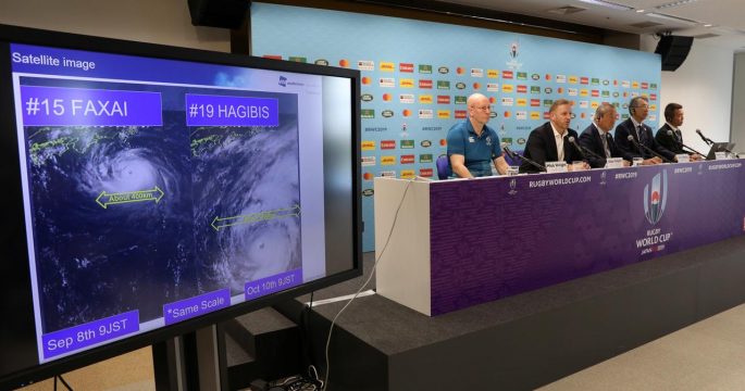 การแข่งขันรักบี้ชิงแชมป์โลก 2 นัดต้องถูกยกเลิกออกไปอย่างที่ไม่เคยเกิดขึ้นมาก่อนเนื่องจากญี่ปุ่น ซึ่งเป็นเจ้าภาพการแข่งขันในครั้งนี้ กำลังจะเผชิญกับพายุ