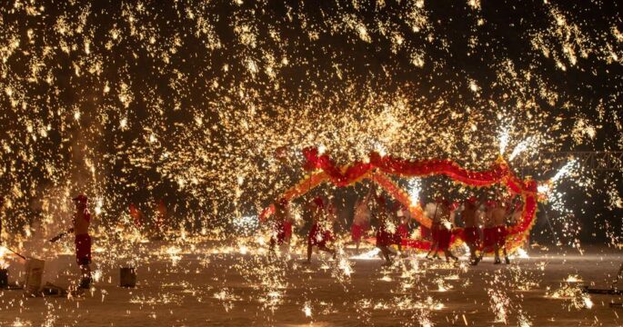 เหล่าศิลปินจัดการแสดงเชิดมังกรไฟสุดตระการตาที่คฤหาสน์วอลการ์ ในนครฮาร์บิน มณฑลเฮยหลงเจียงทางตะวันออกเฉียงเหนือของจีน เพื่อต้อนรับเทศกาลตรุษจีนที่กำลังจะมาถึง โดยการแสดงนี้เริ่มจัดขึ้นที่เขตถงเหลียง เทศบาลนครฉงชิ่งทางตะวันตกเฉียงใต้ของจีน