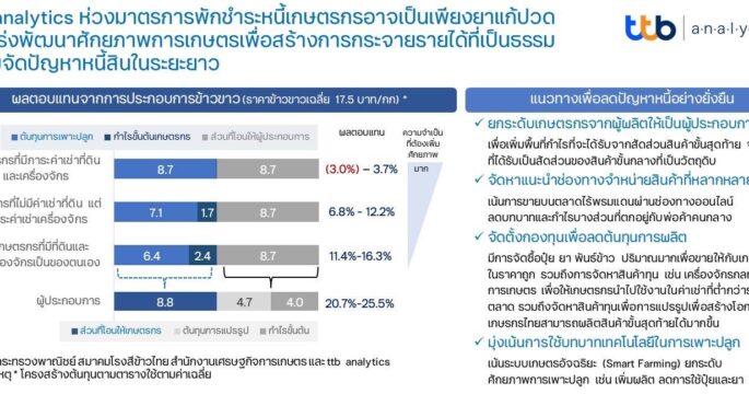 กรุงเทพฯ 5 ต.ค.-ttb analytics ศึกษาพบว่า เกษตรกรไทยเผชิญกับปัญหาเชิงโครงสร้างเกี่ยวกับการกระจายรายได้จากผลผลิตที่ไม่เป็นธรรม ชี้พักชำระหนี้เกษตรกร อาจส่งผลแค่ระยะสั้น กระจายรายได้กลับสู่มือเกษตรกรน้อย แนะเร่งพัฒนาศักยภาพการเกษตร