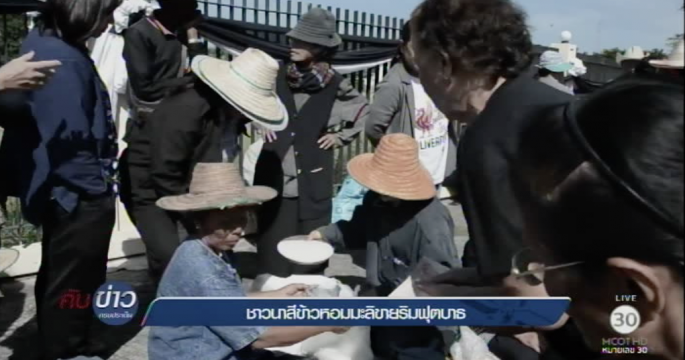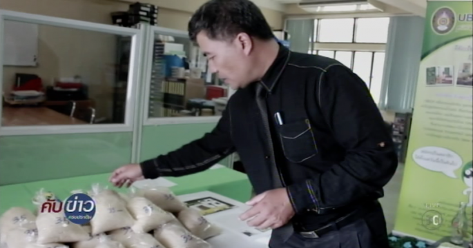 ชาวนาอุบลราชธานีนำข้าวสารหอมมะลิที่สีเองมาขายริมทางเท้า หลังปีนี้ราคาข้าวเปลือกตกต่ำ ขณะที่ยอดจำหน่ายเครื่องสีข้าวเพิ่มขึ้นจากปกติกว่า 20%