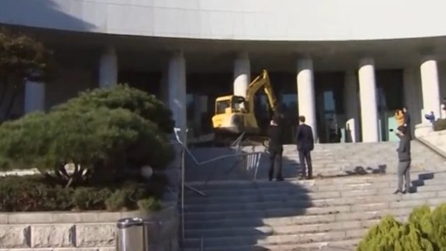 ตำรวจเกาหลีใต้ควบคุมตัวชายคนหนึ่งในวันนี้ ขณะพยายามนำเครื่องจักรขนาดใหญ่บุกเข้ามาทางประตูใกล้สำนักงานอัยการ