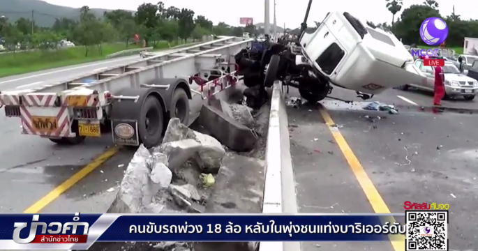 รถพ่วง 18 ล้อพุ่งชนแท่งแบริเออร์ ร่างคนขับกระเด็นกระแทกเก๋งดับ