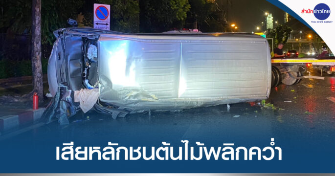 รถตู้เสียหลักชนต้นไม้เกาะกลางถนนรัชดาฯ ดับคาที่