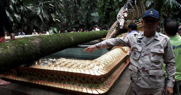 จนท.เร่งตัดซากต้นชะโนดยืนตายมา 10 ปี ถูกลมพายุโค่นล้มทับบ่อน้ำศักดิ์สิทธิ์และเศียรพญานาคเสียหาย พบเสี่ยงยืนตายอีก 3 ต้น ย้ำประชาชนมาเที่ยวได้ปกติ ไม่มีปิดเกาะ