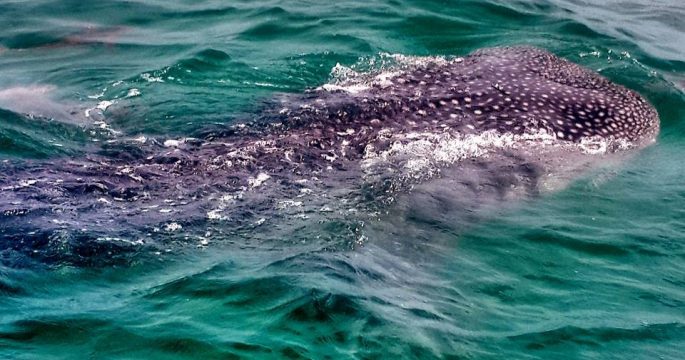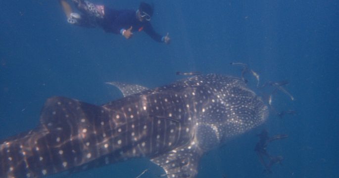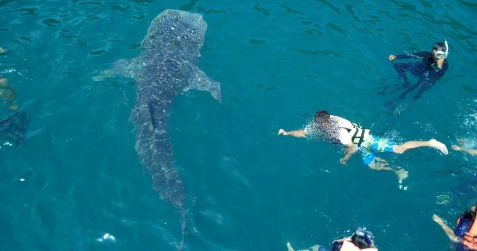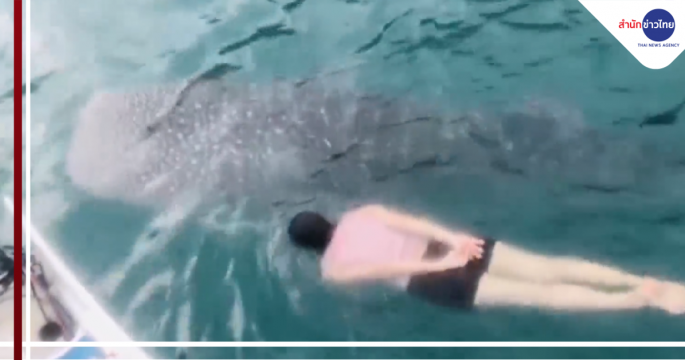 ฉลามวาฬตัวใหญ่ โผล่ว่ายน้ำใกล้เรือพานักท่องเที่ยวไปจอดดำน้ำดูปะการัง ที่เกาะทะลุ จ.ประจวบคีรีขันธ์ นักท่องเที่ยวตื่นตาตื่นใจ ลงไปว่ายน้ำถ่ายภาพคู่