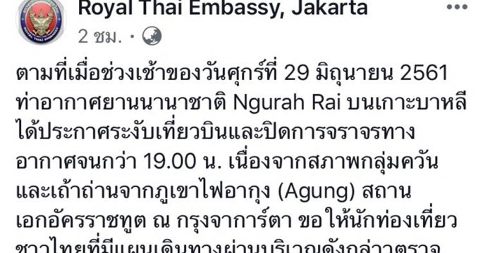 สถานทูตไทยประจำกรุงจาการ์ตา โพสต์ข้อความ ระบุท่าอากาศยานนานาชาติ Ngurah Rai บนเกาะบาหลี ปิดการจราจรทางอากาศจนถึงเวลา 19.00 น. เหตุกลุ่มควันจากภูเขาไฟอากุงปะทุ