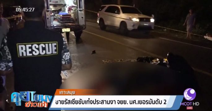 2 นักศึกษาชายหญิงเยอรมนีมาเที่ยวเกาะสมุย ขี่รถจักรยานยนต์ขับแซงกระบะที่อยู่ข้างหน้า ชนกับรถเก๋งชาวรัสเซียที่ขับสวนมา นักศึกษาเยอรมันเสียชีวิตทั้งคู่