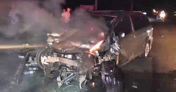รถเก๋งคณะผู้แสวงบุญกลับรถไม่ทันระวัง ถูกรถกระบะที่ขับมาทางตรงพุ่งชนเข้าอย่างแรง ทำให้มีผู้บาดเจ็บ 5 ราย ส่วนรถพังยับ
