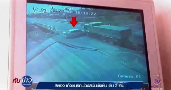 คลิปนาที รถเก๋งวิ่งมาทางสายรองพุ่งชนเสยหัวพ่วง 22 ล้อ กลางแยกผีสิง 100 ศพ อ.นครหลวง จ.อยุธยา ก่อนพุ่งตกสะพาน หนุ่มสาวมากับรถเก๋งตายคาที่ทั้งคู่