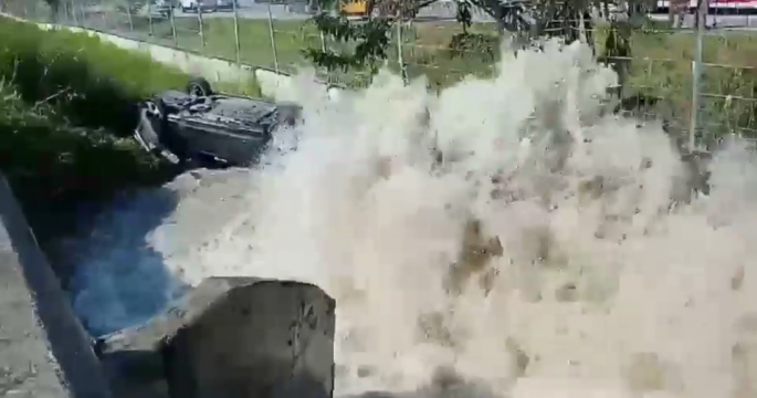 ท่อส่งน้ำดิบแตกมอเตอร์เวย์-บางปะกง เก๋งพลิกหงายท้อง