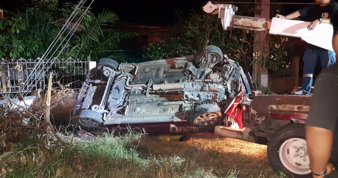 ฝนตกถนนลื่นทำให้คนขับรถยนต์เก๋งขับรถเสียหลักปีนขอบสะพานข้ามแยก ชนเสาไฟสัญญานบอกทางหัก ก่อนรถพลิกคว่ำหงายท้อง เคราะห์ดีคนขับไม่ได้รับบาดเจ็บ