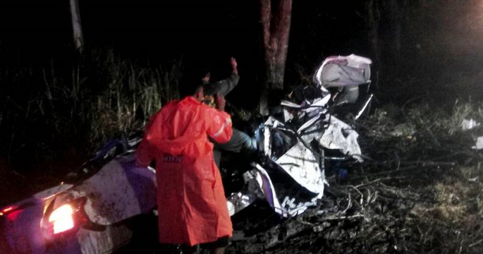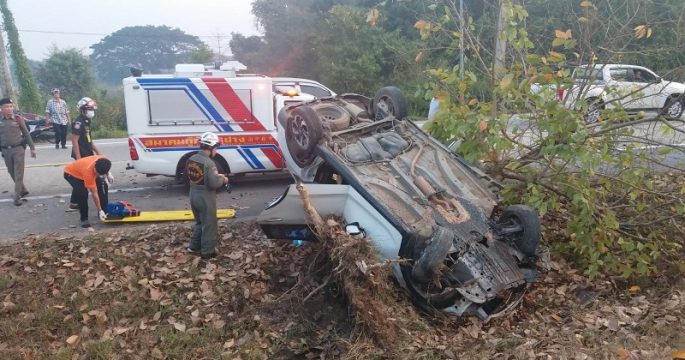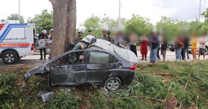 เกิดอุบัติเหตุถนนเมืองลำปาง รถเก๋งชนต้นไม้เต็มแรงพังทั้งคัน ชายคนขับเสียชีวิต