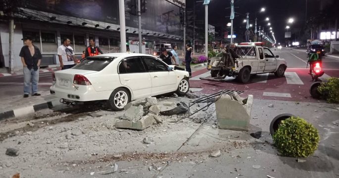 ตำรวจสอบ 2 ชายวัยรุ่น ก่อนดำเนินคดีและเร่งหาตัวเพื่อนคนขับเก๋งสีขาวประสบอุบัติเหตุทางโค้งวงเวียนโลมา เมืองพัทยา ชนทรัพย์สินราชการเสียหาย ในรถพบทั้งขวดเบียร์และมีด