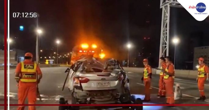 เก๋งเสียหลักชนทางเบี่ยงตกทางด่วน รถพัง-คนขับสาหัส